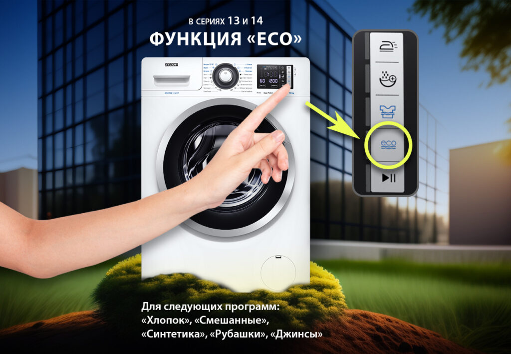 Дополнительная функция «ЭКО» – это режим, который позволяет ухаживаю за бельем, экономно расходуя электроэнергию. Функция используется для средне и слабозагрязненных изделий. Доступен режим на следующих программах: «Хлопок», «Смешанные», «Синтетика», «Рубашки», «Джинсы».