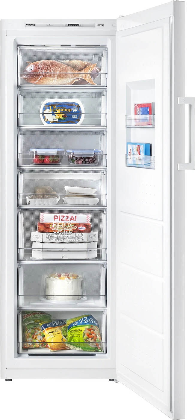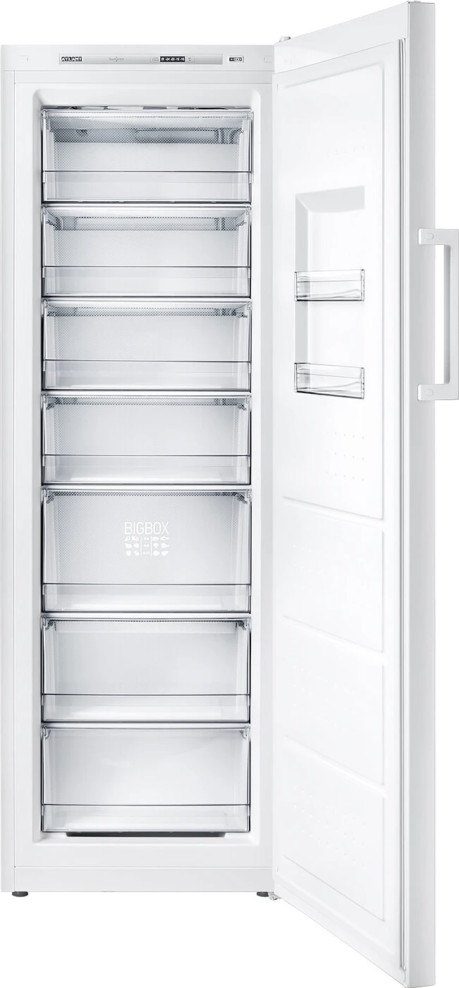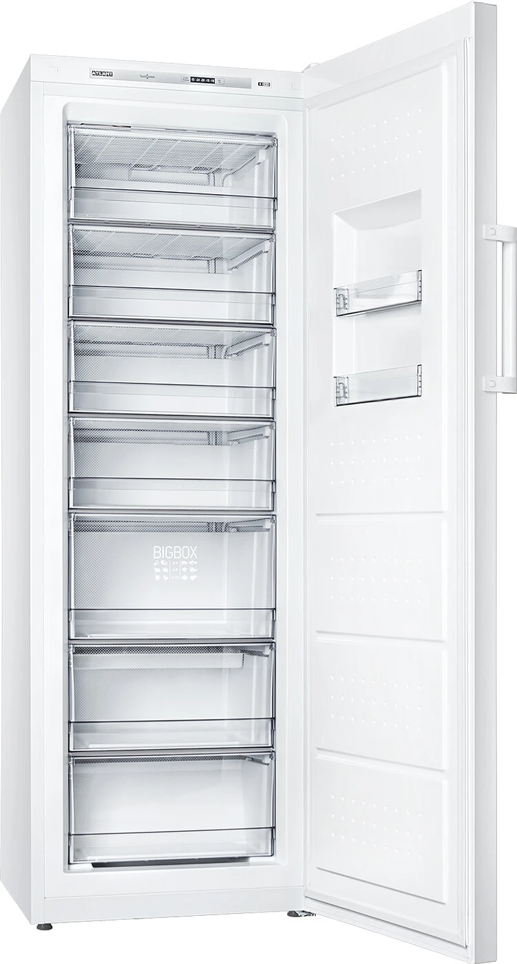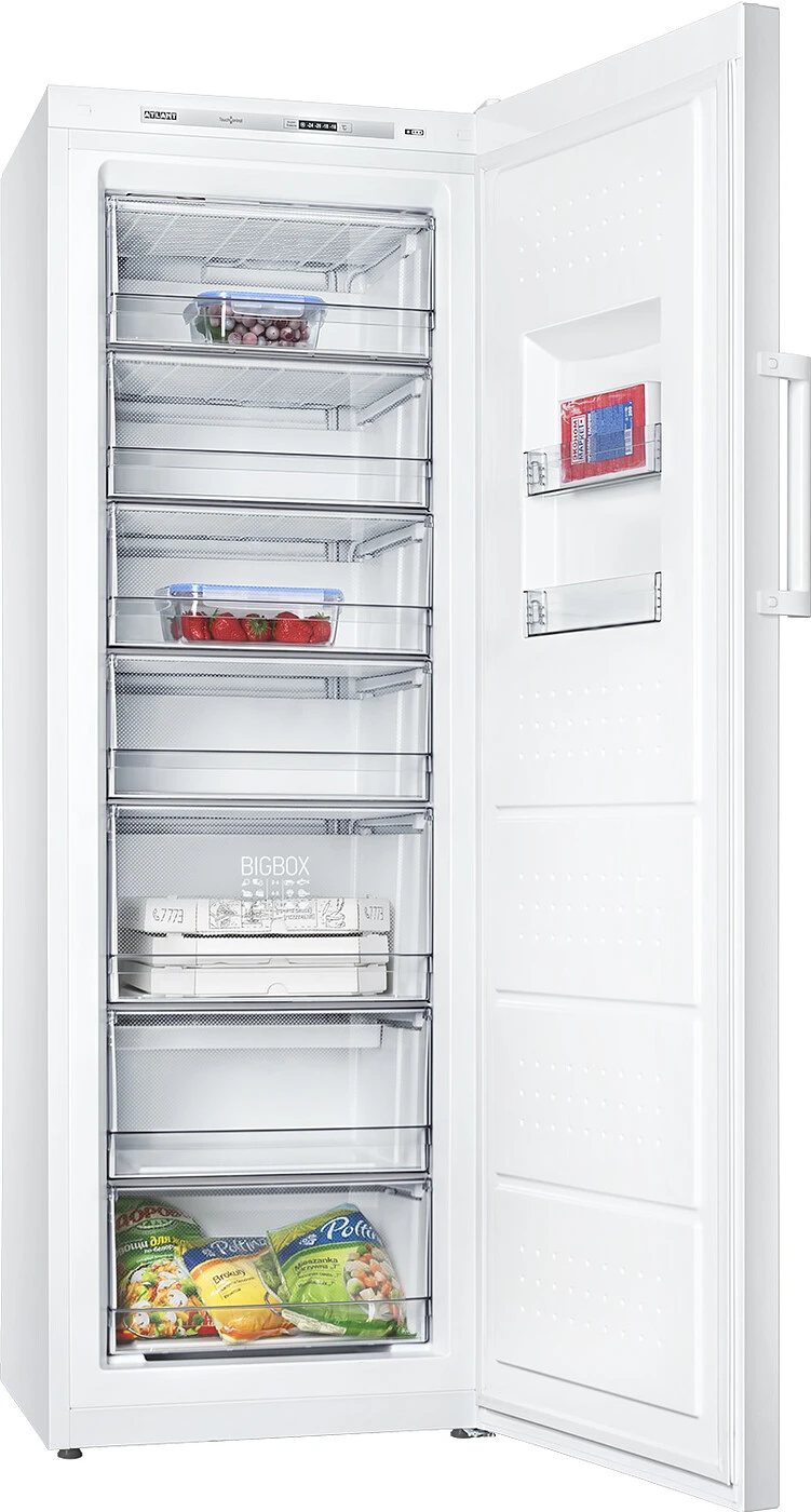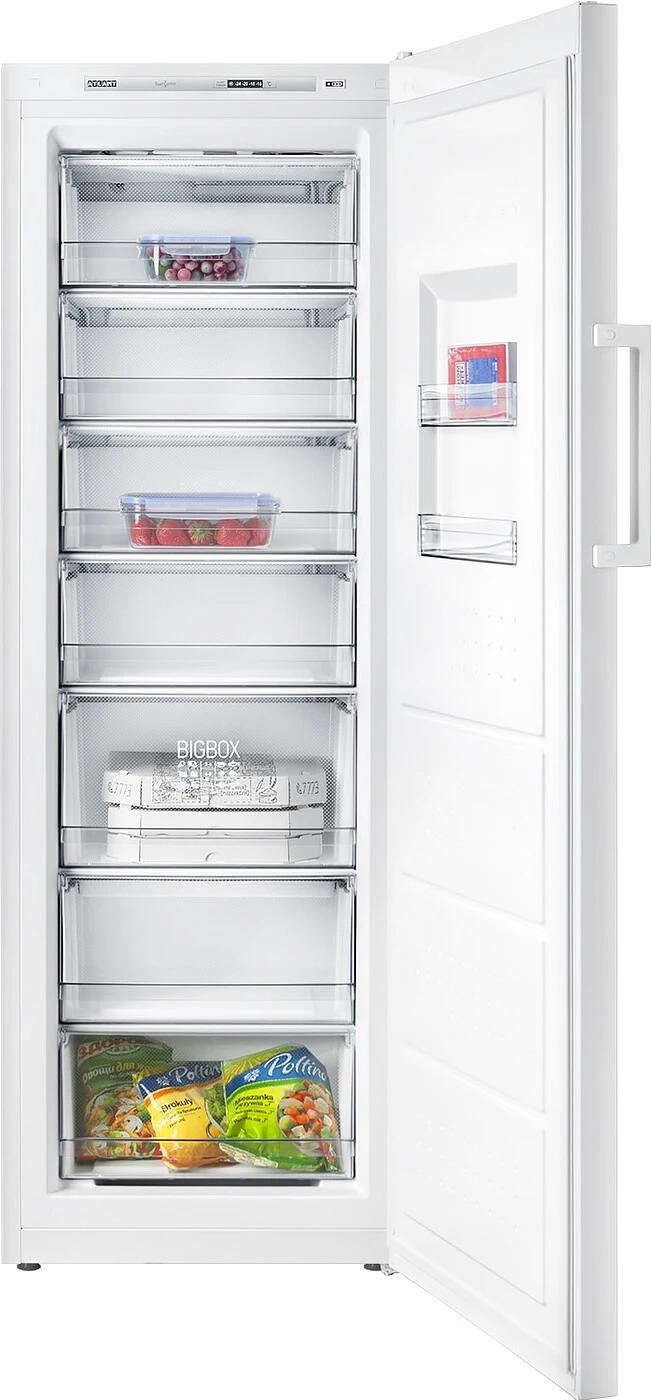 Морозильник выделяется элегантным дизайном в стиле хай-тек и вместительным объемом 260 литров. Оснащен электронной панелью Touch Control и экономичным LED-освещением. Внутри — 7 корзин, стеклянные полки и увеличенная корзина BIG BOX для удобного хранения больших объемов продуктов. Функция «Суперзамораживание» обеспечивает быстрое и качественное замораживание. Все эти особенности делают использование морозильника практичным и комфортным для больших семей и любителей заготовок.