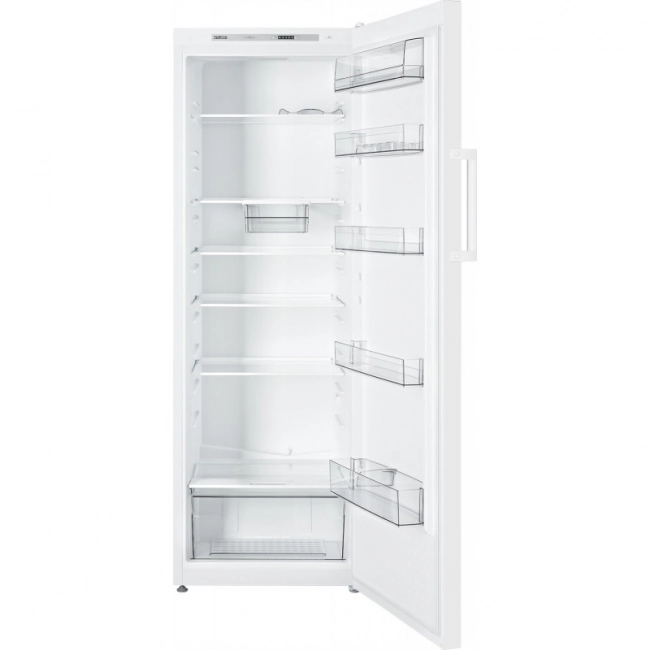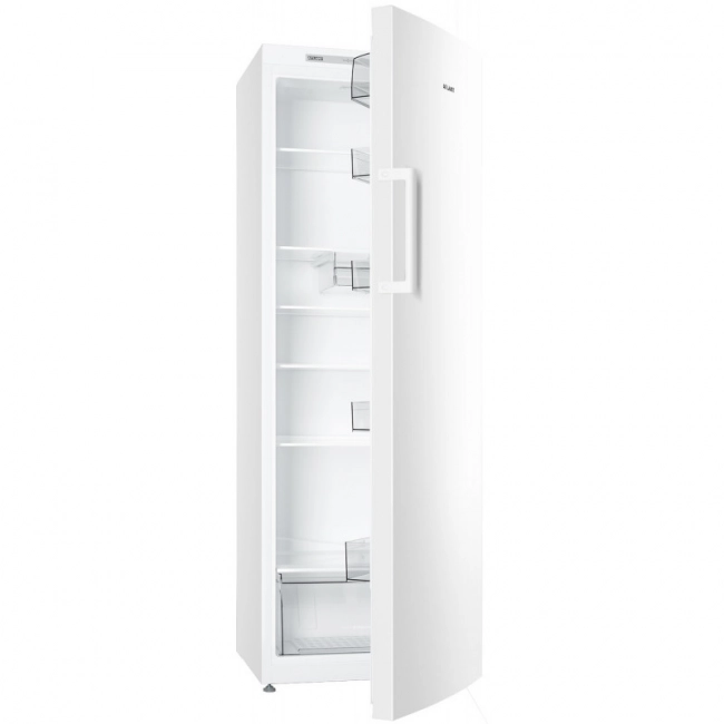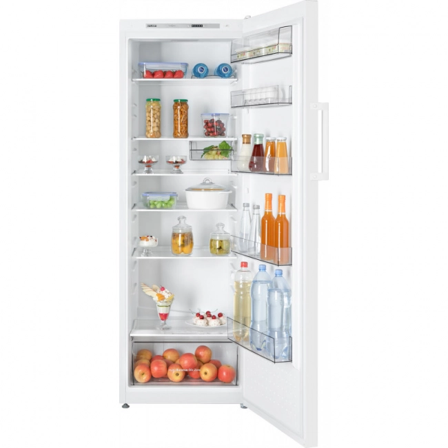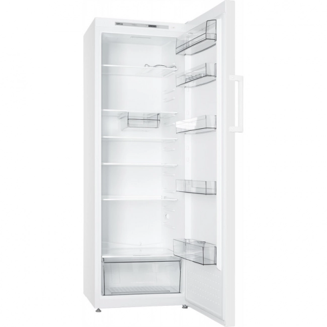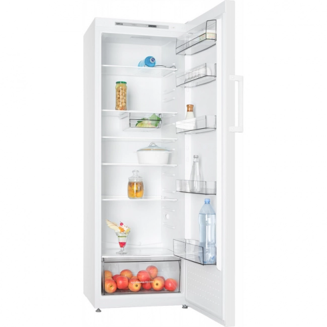 Холодильник выполнен в белом цветовом исполнении с наружной вертикальной ручкой-скобой белого цвета, которая подчеркивает эксклюзивный дизайн модели. В камере расположено 5 полок из закаленного стекла. На двери холодильника установлено 5 емкостей из ударопрочного пластика, в том числе емкость нижняя с ограничителем для бутылок и емкость верхняя с крышкой.