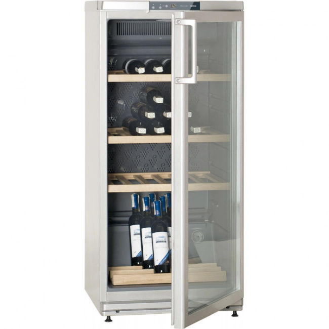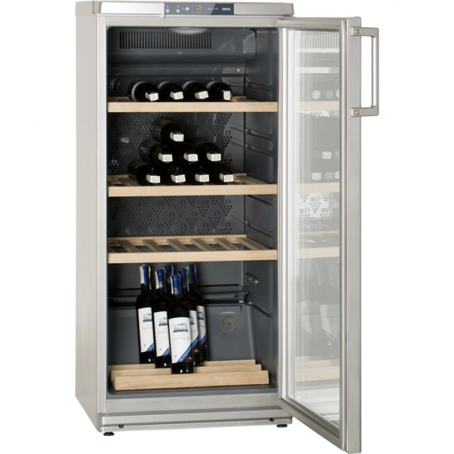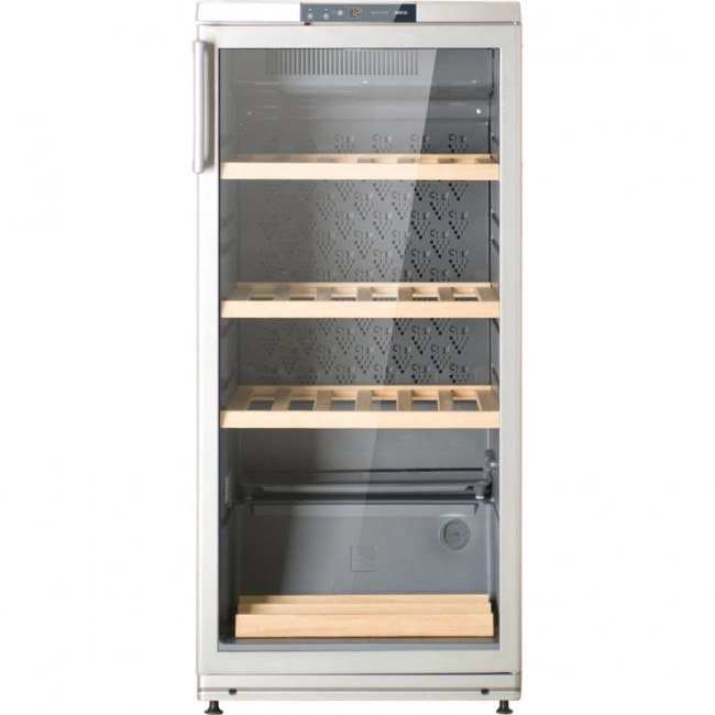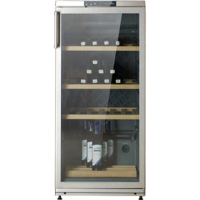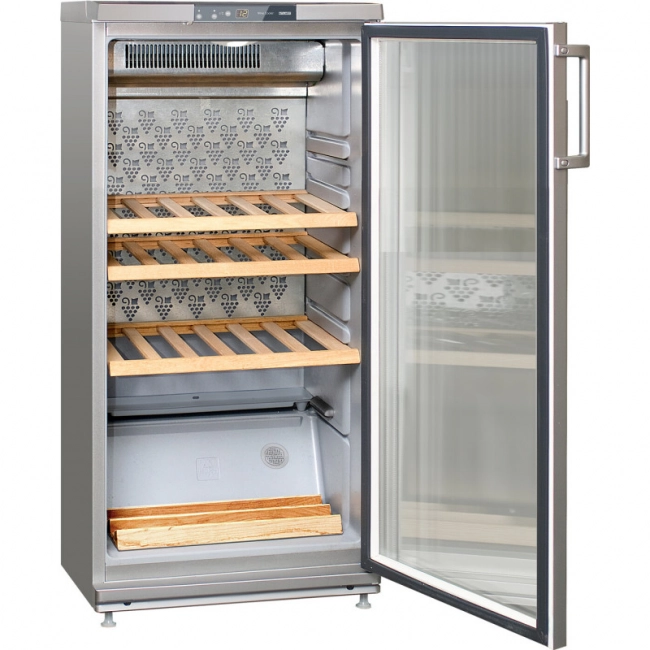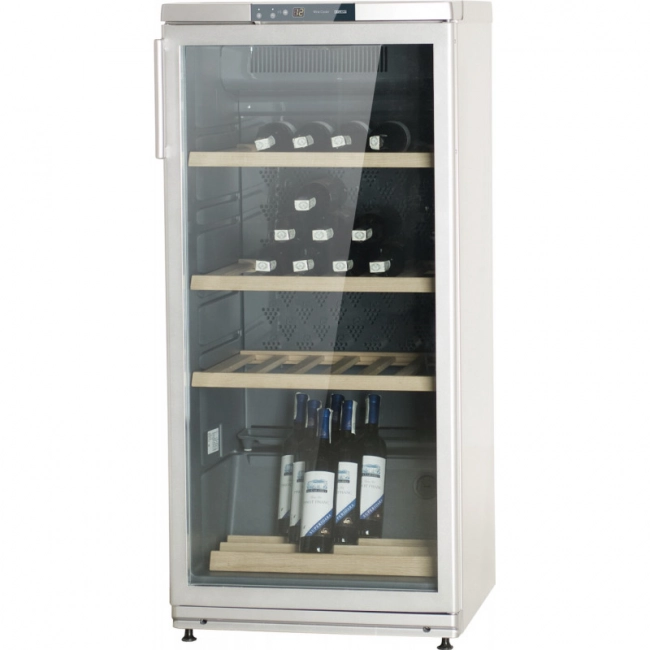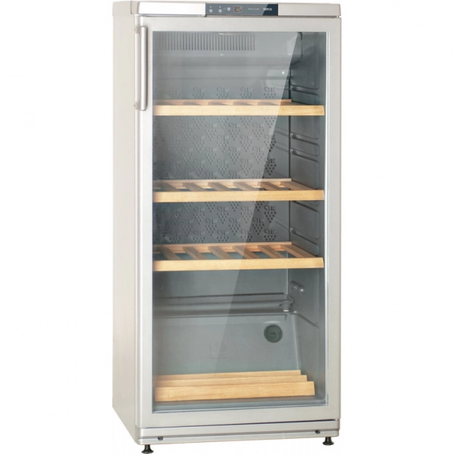 Вертикальное с наклоном размещение бутылок на нижней полке позволяет совмещать хранение вина с его демонстрацией